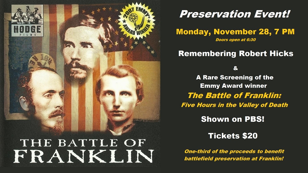 A very rare showing on the big screen of the Emmy Award winning film, “The Battle of Franklin”. The program will include a brief panel discussion and tribute to the late author and preservationist Robert Hicks, with Q & A on the battle, the film, and preservation efforts followed by the showing of the 74-minute documentary on the battle, which was shown on PBS.