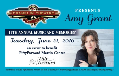 Amy Grant's career spans more than 30 years and stretches from her roots in gospel to becoming an iconic pop star, songwriter, television personality and philanthropist. With three multi- platinum albums, six platinum albums and four gold albums, her total career album sales exceed 30 million. In addition to six Grammy Awards, Grant has earned 26 Dove Awards and has been honored with a star on the Hollywood Walk of Fame. FiftyForward serves a vital need in our community by giving older adults a place to fellowship, find needed resources, and engage in community involvement. Currently, adults 65 years and older are the fastest growing demographic and the FiftyForward Martin Center is advancing their mission to meeting increased needs.